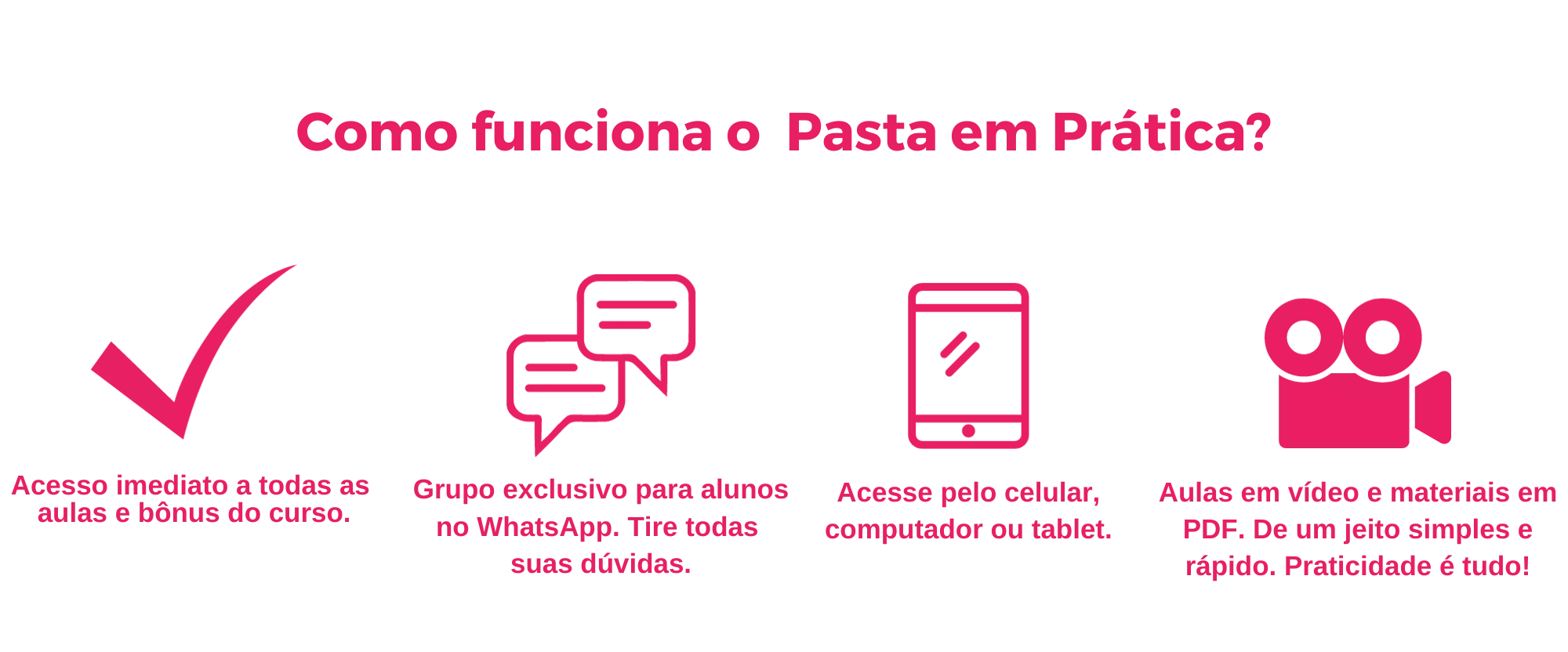 Então o Pasta em Prática é exatamente para você. Sabendo da correria do seu dia, o curso é todo gravado, com vídeos curtos. Assim você assiste e pratica quando tiver alguns minutinhos disponíveis.
