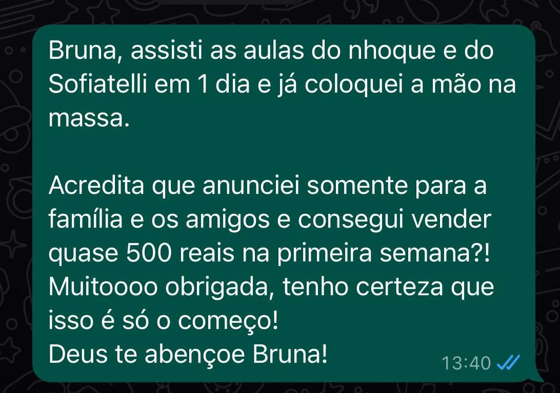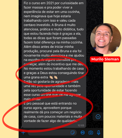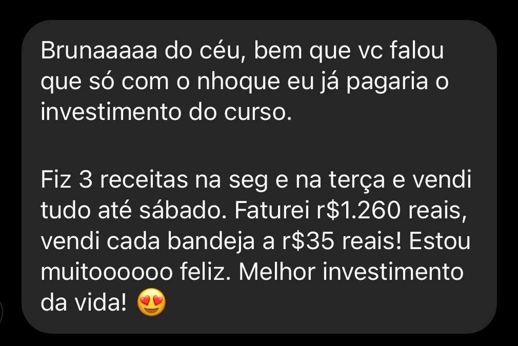 Te garanto uma coisa, se você tiver vontade e colocar em prática os ensinamentos do curso, mesmo se você nunca tiver fritado um ovo, você irá conseguir faturar pelo menos 200 reais na primeira semana. Basta você querer, pois eu estarei aqui pra te ajudar.